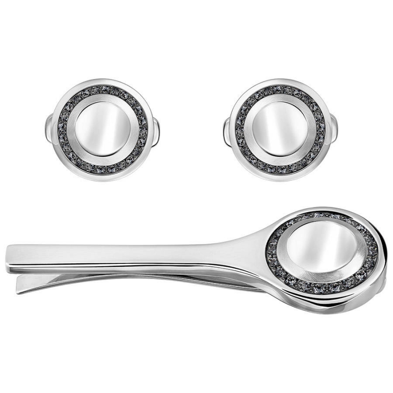 Мужское украшение простого современного дизайна. Этот минималистичный комплект включает в себя пару запонок и булавку для галстука. Тёмные кристаллы на фоне полированной нержавеющей стали придают этим изделиям утончённый контраст. Этот мужской аксессуар, очень изысканный и современный, прекрасно подходит на каждый день. Он станет замечательным подарком. Размер запонок – 2 см, булавки для галстука – 4,5 см. | |