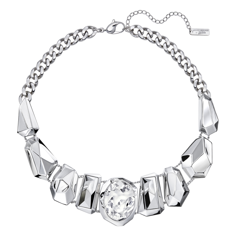 В этом изумительном украшении вы будете выглядеть потрясающе в любой обстановке. созданное Жан-Полем Готье, словно отражает тему совершенства несовершенства. Драматичные прозрачные кристаллы огранки Kaputt, созданной этим дизайнером, сверкают в скульптурных гнёздах с родиевым покрытием. Они закреплены на массивной цепочке, покрытой тем же металлом. Это броское актуальное украшение внесёт в вашу коллекцию искру подиумного шика. Ожерелье длиной 38 см украшено логотипом коллекции Жан-Поля Готье для Atelier Swarovski. | |