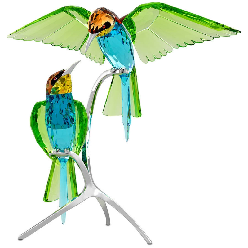 Эти яркие пчелоеды с любовью смотрят друг на друга. Две птицы из кристаллов цвета Peridot сидят на серебристой металлической подставке. Их головы мерцают кристаллами цвета Smoked Topaz. Акценты на туловище сделаны из кристаллов цвета Jonquil и Indicolite. Эти умело изготовленные фигурки состоят примерно из 30 деталей. Декоративный объект. Не игрушка. Не подходит для детей младше 15 лет. | |