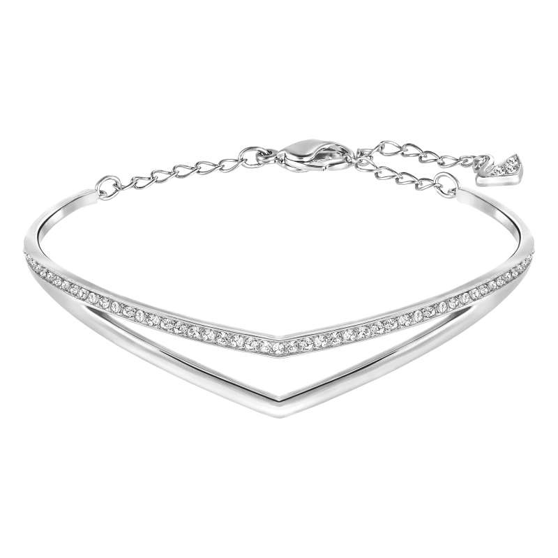 Изысканное, шикарное и при этом нетребовательное изделие. Основной элемент дизайна – органичный двойной V-образный силуэт. Браслет соответствует моде этого сезона на многослойные украшения. Прозрачное кристальное паве и родиевое покрытие на металле ярко блестят. Совет стилиста. наденьте сразу и другие браслеты Swarovski с покрытием из разных металлов, чтобы получился модный образ. Браслет размером 5,9 х 4,5 см снабжён застёжкой на цепочке регулируемой длины. | |