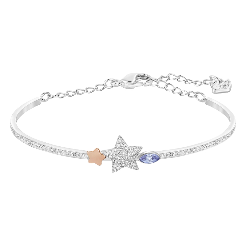 Этот новогодний жёсткий браслет с прозрачным кристальным паве декорирован двумя звёздами и голубым кристаллом. Контрастное сочетание покрытия из розового золота на металле, прозрачных кристаллов и голубых тонов производит большое впечатление. Добавьте другие жёсткие браслеты, и получится модный образ. Регулируемая застёжка-карабин обеспечивает надёжную фиксацию. | |