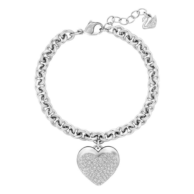 Это идеальный подарок и на День святого Валентина, и на любой другой праздник. Это разноплановое женственное украшение сделано в виде сердца. Одна сторона покрыта сверкающим прозрачным кристальным паве, другая – блестящим слоем родия, поэтому дизайн можно варьировать на свой вкус. К браслету длиной 16 см прилагается аккуратная цепочка-вставка. Он особенно эффектно смотрится в сочетании с подвеской, серьгами и кольцами аналогичного дизайна. | |
