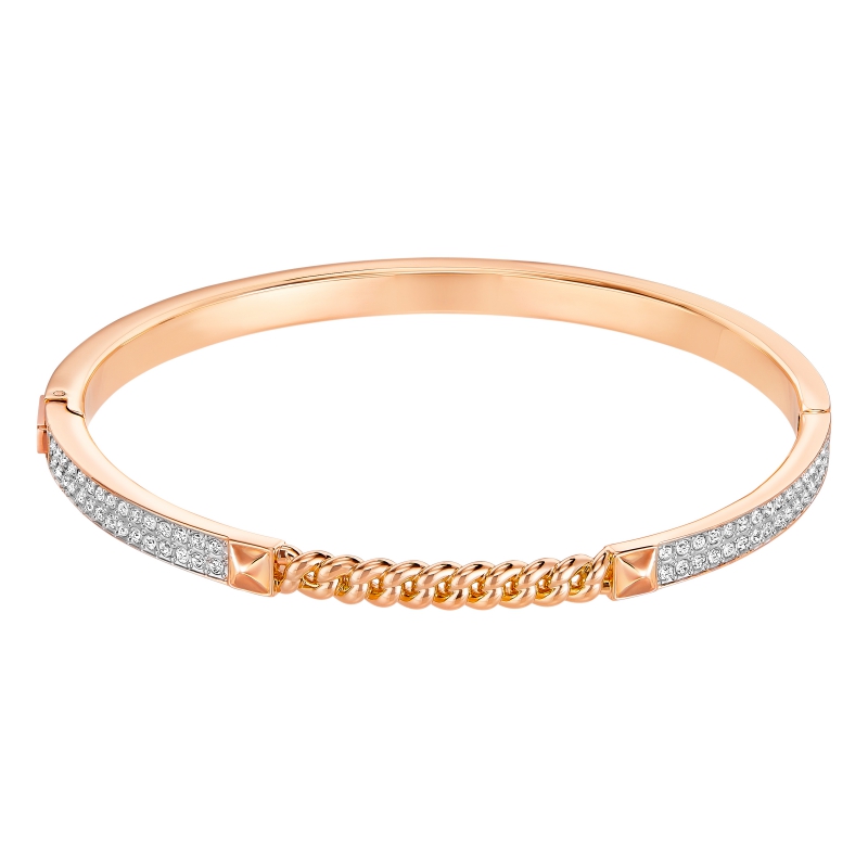 Этот изысканный жёсткий браслет внесёт рокерскую ноту в любой образ, как в дневной, так и в вечерний. Уникальная жёсткая цепочка с металлическими заклёпками, покрытыми розовым золотом, красиво сочетается с прозрачным кристальным паве. Браслет снабжён удобной поворотной застёжкой. Наденьте его вместе с другими жёсткими браслетами, чтобы получился модный образ. | |