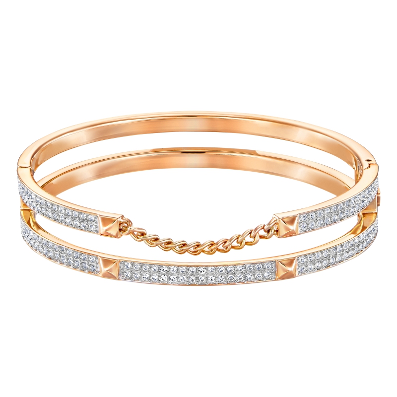 Современный блеск в рокерском стиле. Этот изящный, очень изысканный жёсткий браслет выведет любой образ, как дневной, так и вечерний, на новую высоту. Комплекты колец сегодня на пике моды. В этом уникальном изделии жёсткая цепочка с металлическими заклёпками, покрытыми розовым золотом, красиво сочетается с прозрачным кристальным паве. Он удачно сочетается с другими украшениями. | |