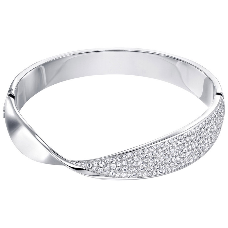 Классическое, органичное и женственное украшение. Этот жёсткий браслет с поворотным механизмом покрыт золотом и декорирован прозрачным кристальным паве. Он внесёт в повседневный образ умеренную дозу блеска. Днём его можно надеть с мягким браслетом и часами Swarovski, а вечером добавить несколько жёстких браслетов, чтобы создать иллюзию браслета-каффа.