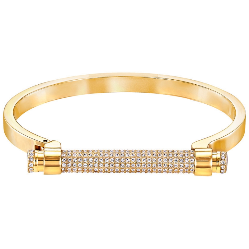 Этот плоский и жёсткий сверху браслет с позолотой выглядит очень современно. Застёжка в виде планки с кристальным паве прекрасно вписывается в общий дизайн. Чтобы её открыть, надо нажать на кнопку.Это изделие замечательно сочетается с другими украшениями Swarovski.