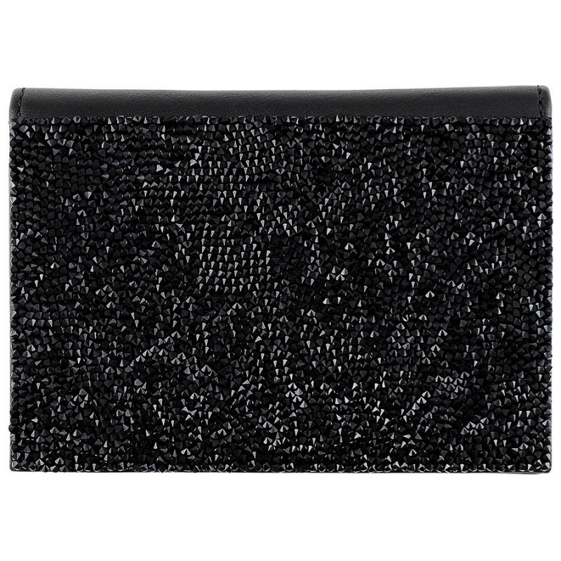 Передняя часть этой изящной визитницы мерцает чёрными кристаллами в закрепке Crystal Rock. Элегантная задняя часть сделана из чёрной телячьей кожи. Внутри предусмотрено два плоских кармашка. На подкладке изображён мотив Swanflower®. Это модное сверкающее произведение идеально подходит и для особых случаев, и на каждый день. Приблизительный размер: 7,5 х 11 х 1,5 см. | |