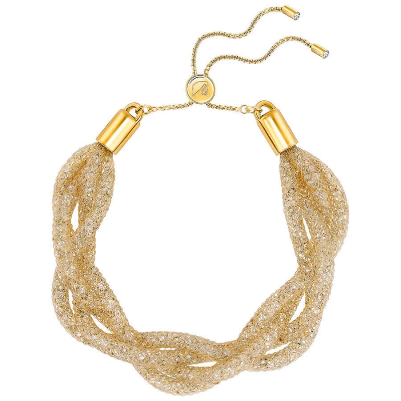 Это позолоченное украшение, инновационное и изысканное, дополнило популярную коллекцию Stardust. Как и другие изделия этой серии, оно представляет собой объёмную трубочку из нейлоновой сетки, заполненную сверкающими кристаллами, на этот раз золотистыми. Это украшение выглядит ещё шикарнее, потому что трубочки переплетены в косу. Он восхитительно выглядит и отдельно, и в составе модного сочетания с другими браслетами. | |
