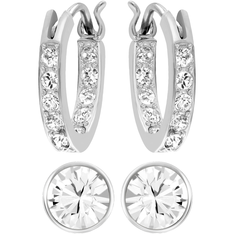 Этот уникальный комплект состоит из двух пар серёг с родиевым покрытием. Миниатюрные обручи аккуратно украшены прозрачным кристальным паве. Их можно носить отдельно или подвесить к прозрачным кристальным серьгам-пусетам. Выберите вариант под настроение, и ваш повседневный образ наполнится блеском. | |