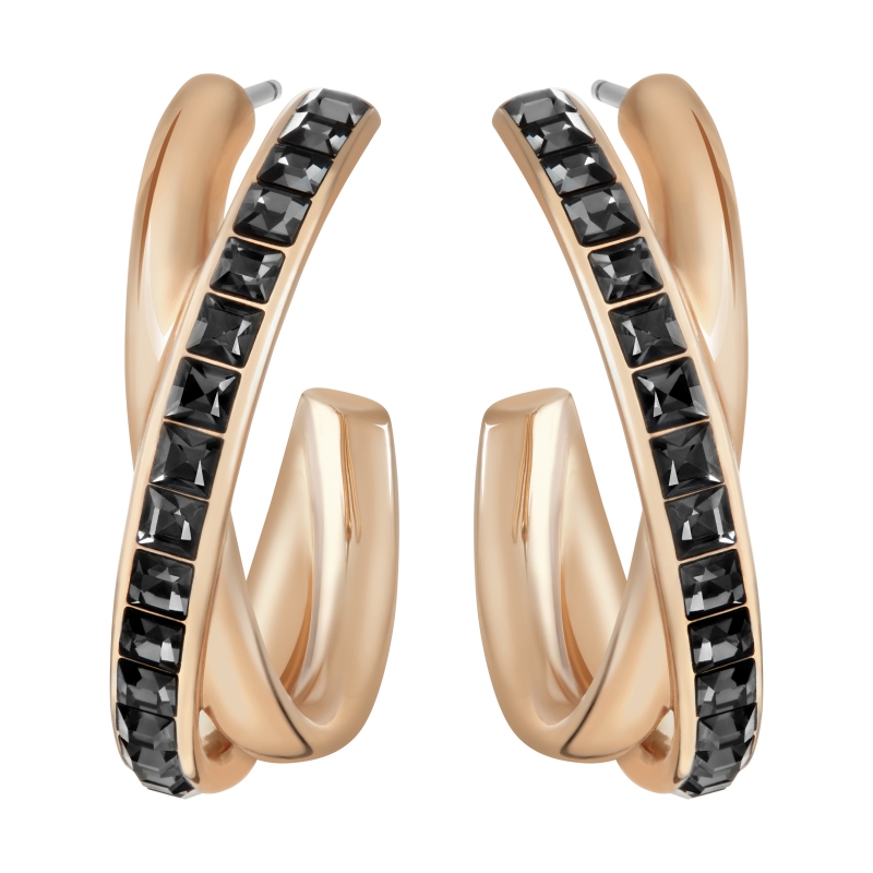 Источником вдохновения для создания этих серёжек-обручей послужили окружности и спирали. Тёмные кристаллы контрастируют здесь с покрытием из розового золота на металле. Это изысканное произведение озарит ваш образ на досуге грамотно отмеренной вспышкой блеска. | |