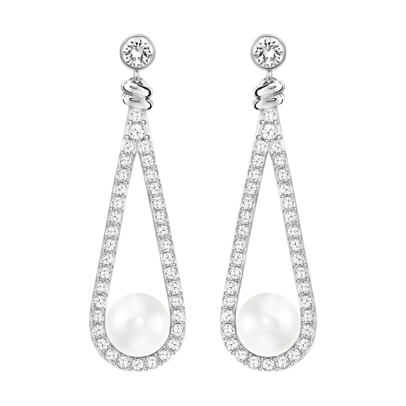 Жемчужные украшения современного дизайна сделаны в виде узлов, символизирующих вечную любовь. В этих серьгах белые кристальные жемчужины, гладкие и круглые, сочетаются с прозрачным кристальным паве и родиевым покрытием на металле. Они прекрасно сочетаются с другими украшениями Swarovski и станут идеальным подарком на День рождения и на любой другой праздник. Размер серёг – 3 см. | |