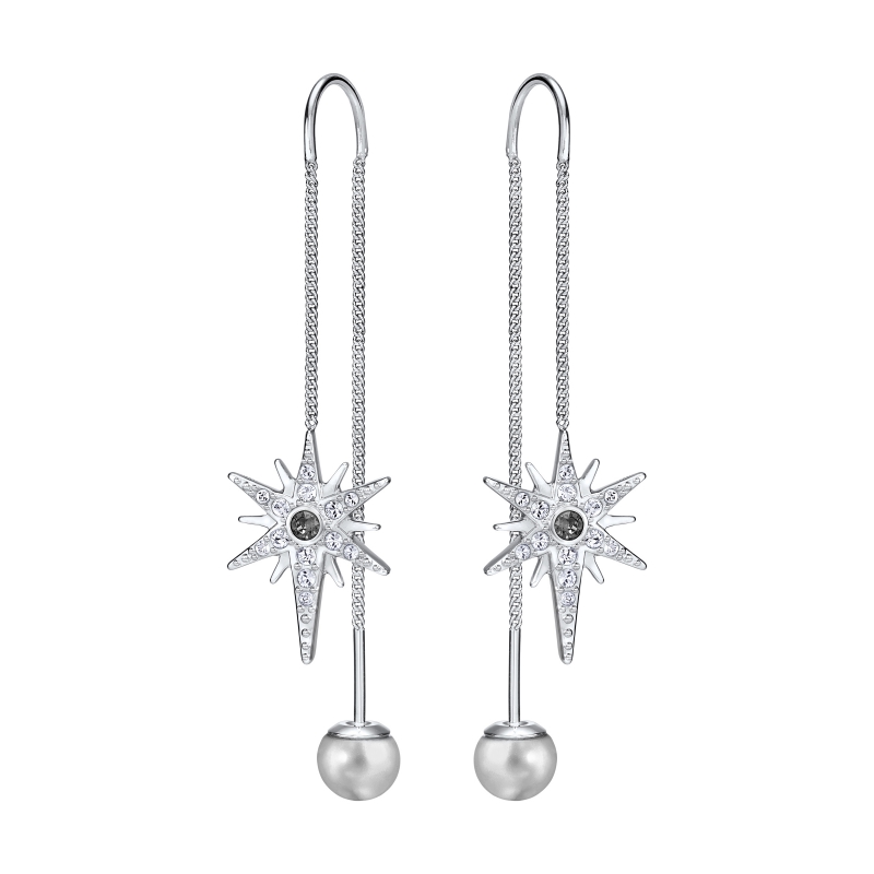 Небесные мотивы с элементами глэм-рока. Эти модные длинные серьги символизируют звёзды. Они украшены прозрачным кристальным паве и серыми кристальными жемчужинами. Размер серёг с родиевым покрытием – 5,5 см. Совет стилиста: наденьте на другое ухо серьгу покороче, и получится модный в этом сезоне асимметричный образ. | |