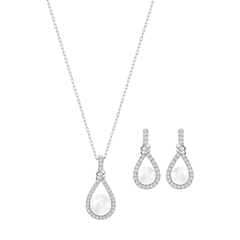 Жемчужные украшения современного дизайна сделаны в виде узлов, символизирующих вечную любовь. Этот романтичный комплект состоит из ожерелья и пары серёг. В каждом элементе белая кристальная жемчужина, гладкая и круглая, сочетается с прозрачным кристальным паве и родиевым покрытием на металле. Украшения из коллекции Enlace станут прекрасным подарком на День рождения и на любой другой праздник. Длина ожерелья – 38 см, размер серёг – 2 см. | |