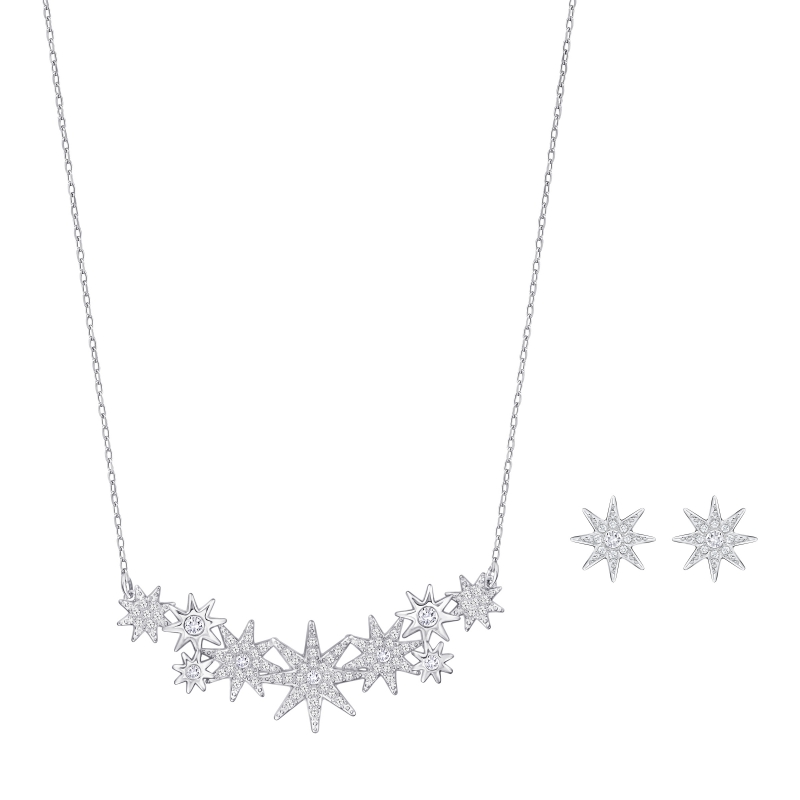 Нежное воплощение звёздного неба. Этот изысканный комплект – ожерелье и пара серёг – идеально подходит для праздничных вечеринок. Он также станет замечательным подарком. Прозрачное кристальное паве восхитительно сияет на фоне металла с родиевым покрытием. Длина ожерелья – 38 см, серёгразмер серёг – 1 см. | |