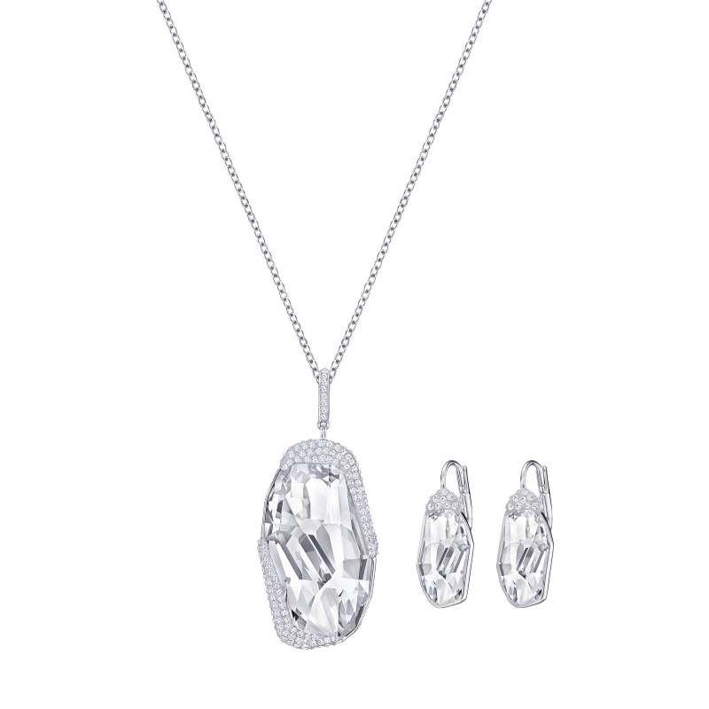 Оригинальная вариация на тему классического сверкающего дизайна. Эти украшения с родиевым покрытием и полностью огранёнными кристаллами сияют ещё ярче благодаря миниатюрным кристаллам в эксклюзивной закрепке Swarovski Pointiage®. Серебристый оттенок идеально подходит на каждый день. Этот комплект состоит из ожерелья (45 см) и пары серёг (2 см). Он также может стать замечательным подарком. | |