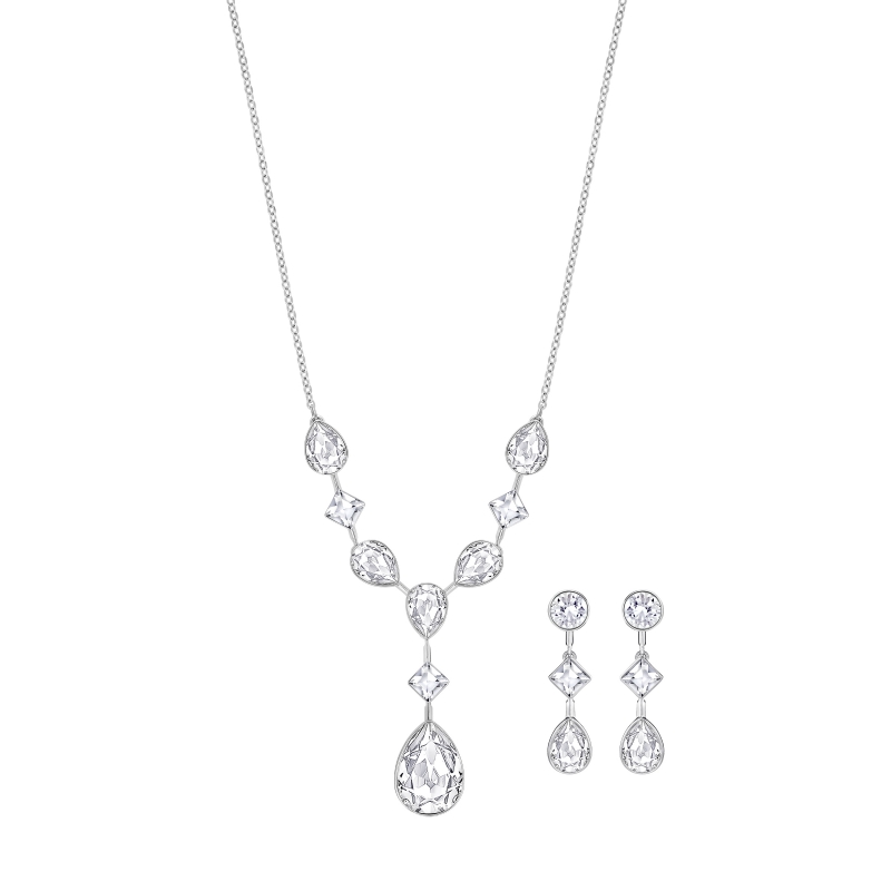 Этот роскошный комплект состоит из ожерелья и пары многогранных серёг с подвесками. Чистейшие кристаллы необычных силуэтов ярко сверкают.Украшения покрыты родием: драгоценным металлом, который не темнеет. В этом потрясающем комплекте вы окажетесь в центре всеобщего внимания в любой обстановке. Длина серёг с подвесками – 3 см, ожерелья – 40 см. | |