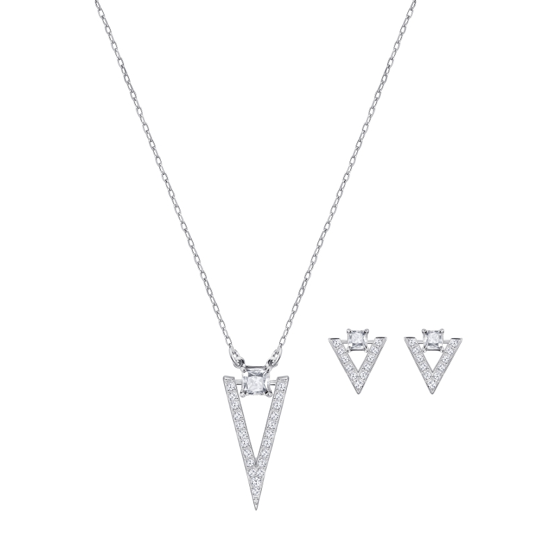 Этот классический комплект состоит из ожерелья и пары серёг. Прозрачные кристаллы изумительно сверкают на фоне родиевого покрытия. Квадратные камни восхитительно сочетаются с шевронами, покрытыми кристальным паве. Классический блеск прекрасно уравновешивает современный стиль. Длина ожерелья – 40 см, серёгразмер серёг – 1 см. | |