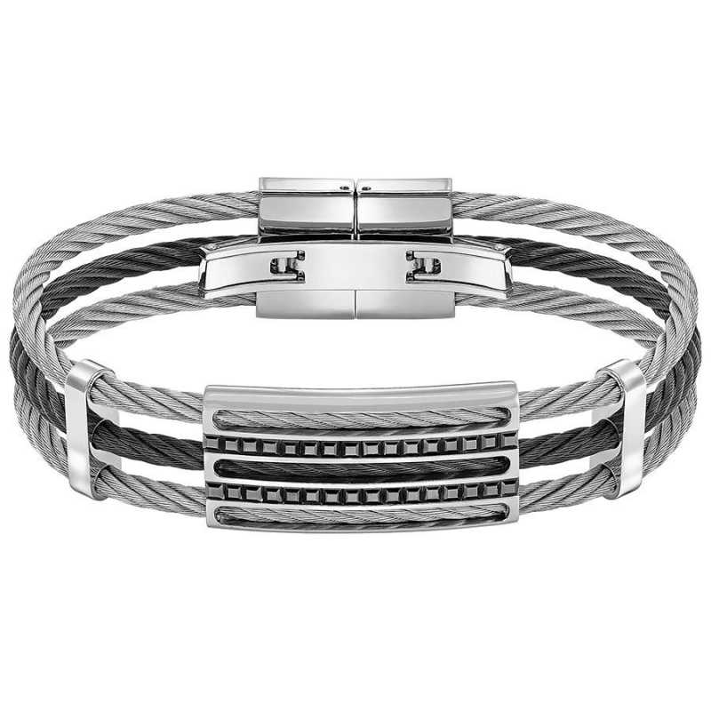 Одна из деталей этого потрясающего современного браслета включает в себя отрезок кабеля. Чёрные кристаллы в гнездовой закрепке сверкают на фоне блестящего металлического покрытия, нанесённого осаждением паров, и нержавеющей стали. Неярко поблёскивающее украшение простого силуэта в мужском стиле внесёт изысканность в неформальный образ. | |