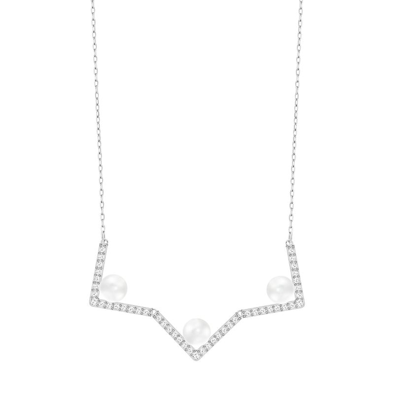 Стильная графичная вариация на тему классического жемчужного ожерелья. Это романтичное женственное ожерелье отличается изумительным, очень изысканным дизайном. Оно сделано из кристальных жемчужин и V-образных элементов из металла с родиевым покрытием и кристального паве. Совет стилиста. Добавьте ожерелье Edify среднего размера с покрытием из розового золота, чтобы получилось модное сочетание металлов. Длина ожерелья – 38 см. | |