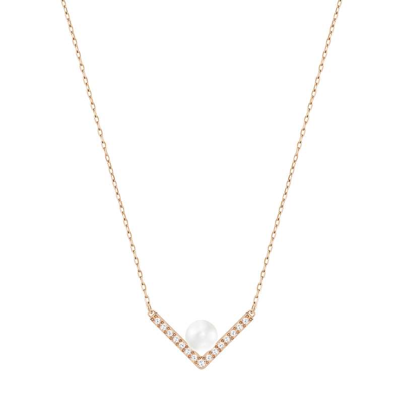 Стильная графичная вариация на тему классического жемчужного ожерелья. Это необычно изысканное ожерелье декорировано кристальной жемчужиной и V-образным металлическим элементом с покрытием из розового золота и кристальным паве. Совет стилиста. Наденьте сразу и другие ожерелья и подвески с покрытием из разных металлов, чтобы получился модный образ. Длина ожерелья – 38 см. | |