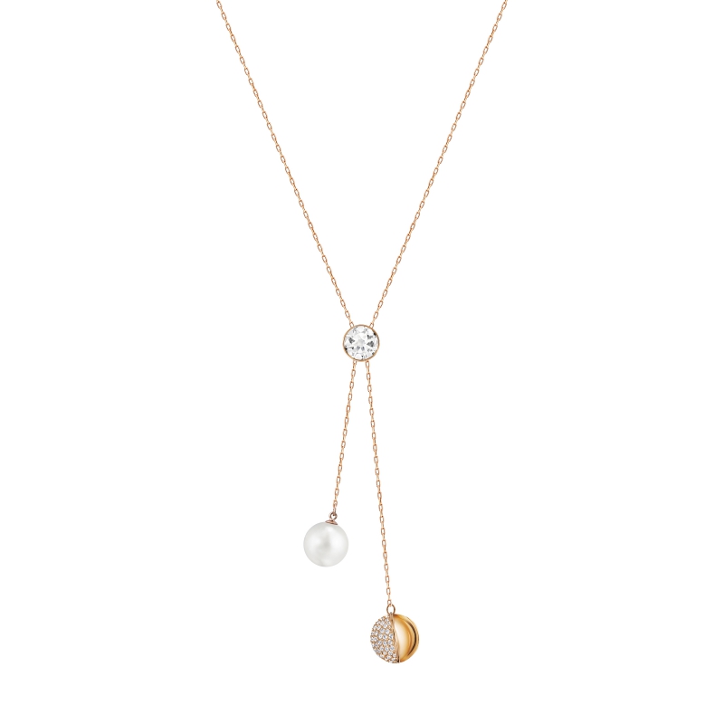 Украшение изысканного современного дизайна, который можно варьировать на свой вкус. Это модное ожерелье, символизирующее небесные тела, сделано из металла с покрытием из розового золота и украшено кристальным паве и кристальными жемчужинами. Уникальный скользящий механизм позволяет перемещать кристальные подвески и создавать разные образы. Длина ожерелья – 75 см. | |