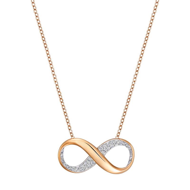 Это современное украшение внесёт ноту блеска в ваш повседневный образ. Подвеска уникального дизайна сделана в виде ленты, красиво изогнутой в форме символа бесконечности. Одна сторона символа бесконечности блестит покрытием из розового золота на металле, другая мерцает прозрачным кристальным паве. К подвеске размером 3 х 1,5 см прилагается цепочка длиной 40 см. Мы предлагаем и другие изделия аналогичного дизайна. | |