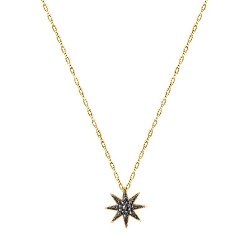 Роскошное сочетание чёрного цвета и золота сейчас на пике моды, и коллекция Firework прекрасно это демонстрирует. Эта элегантная подвеска в виде одной звезды сверкает чёрными кристаллам на фоне покрытия из золота и чёрного рутения. Она удачно вписывается и в неформальный, и в нарядный стиль. К этой роскошной авангардной подвеске размером 1,5 х 1,5 см прилагается позолоченная цепочка длиной 38 см. | |