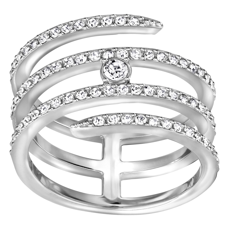 Украшение спирального силуэта выглядит, как целый комплект колец. Такие имитации сегодня в моде. Кольцо с родиевым покрытием сверкает прозрачным кристальным паве. Оно прекрасно сочетается с другими украшениями Swarovski.