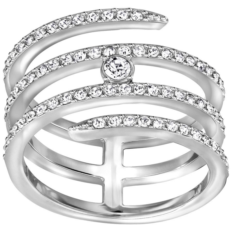 Украшение спирального силуэта выглядит, как целый комплект колец. Такие имитации сегодня в моде. Кольцо с родиевым покрытием сверкает прозрачным кристальным паве. Оно прекрасно сочетается с другими украшениями Swarovski.