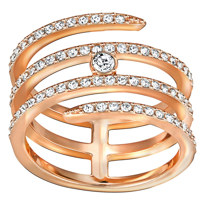 Украшение спирального силуэта выглядит, как целый комплект колец. Такие имитации сегодня в моде. Кольцо с покрытием из розового золота сверкает прозрачным кристальным паве. Оно прекрасно сочетается с другими украшениями Swarovski.