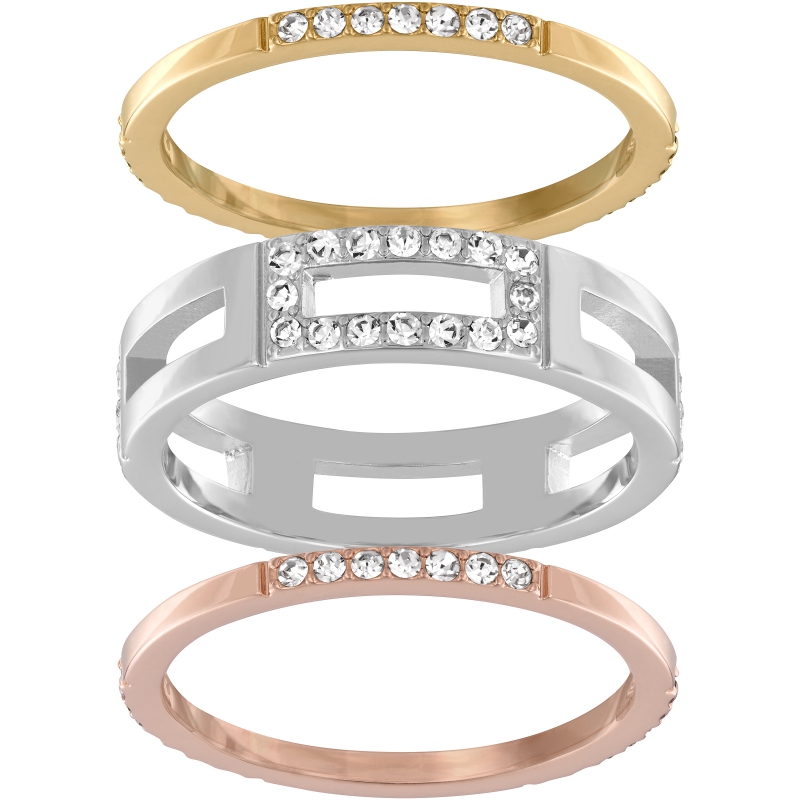 Три кольца Swarovski, из которых состоит этот комплект, оформлены в геометрическом стиле. Их можно надеть на один палец или носить по отдельности в качестве менее броских украшений. Они покрыты золотом, родием и розовым золотом соответственно. Все три кольца украшены прозрачным кристальным паве.