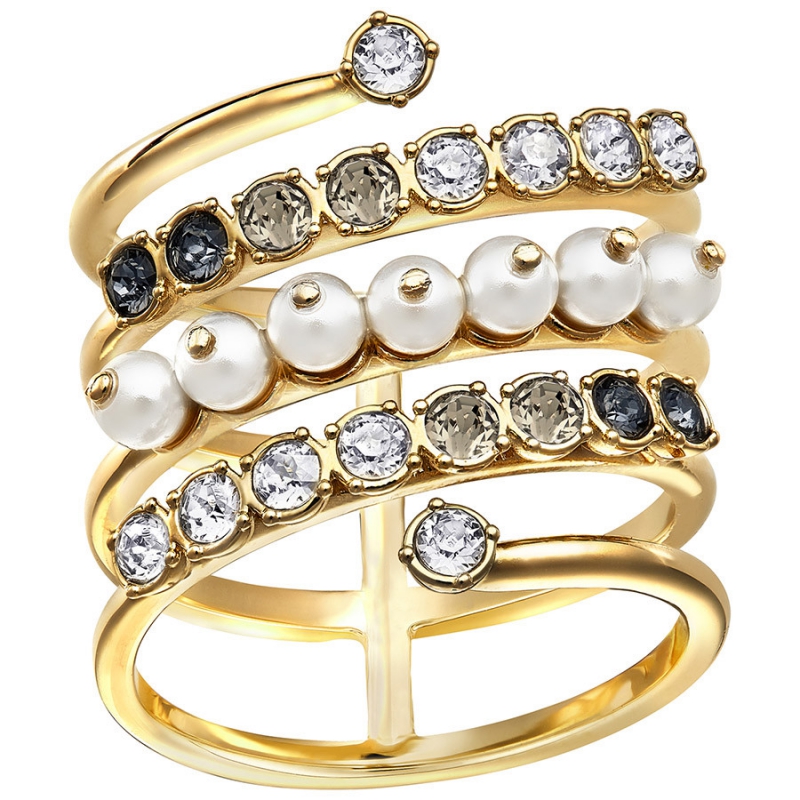 Кольцо East модно спирального силуэта прекрасно смотрится и днём, и вечером. Оно сверкает потрясающей россыпью кристаллов и кристальных жемчужин Swarovski натуральных оттенков, от кремового до тёмно-серого. Металл позолочен, поэтому он не потемнеет. | |