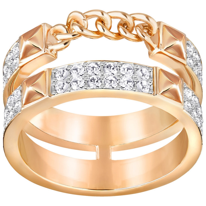 Современный блеск в рокерском стиле. Это изысканное кольцо выведет любой образ, как дневной, так и вечерний, на новый уровень. Комплекты колец сегодня на пике моды. В этом уникальном изделии жёсткая цепочка с металлическими заклёпками, покрытыми розовым золотом, красиво сочетается с прозрачным кристальным паве. Добавьте другие кольца, чтобы создать ещё более актуальный образ.