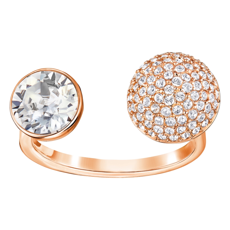 Шикарное современное кольцо модного разомкнутого силуэта. Сферы с покрытием из розового золота и прозрачным кристальным паве напоминают небесные тела. Совет стилиста: добавьте другие кольца, и получится модная в этом сезоне сверкающая россыпь на Ваших пальцах.