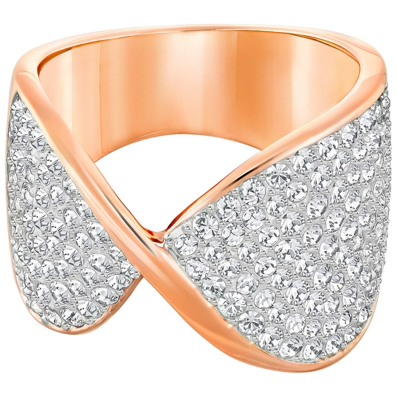 Потрясающий стиль. Это впечатляющее широкое кольцо женственного органического силуэта покрыто розовым золотом. Передняя половина ярко блестит благодаря прозрачному кристальному паве. Это украшение идеально подходит для особых случаев. Наденьте на соседний палец узкое гладкое кольцо с паве, и получится шикарное контрастное сочетание. | |