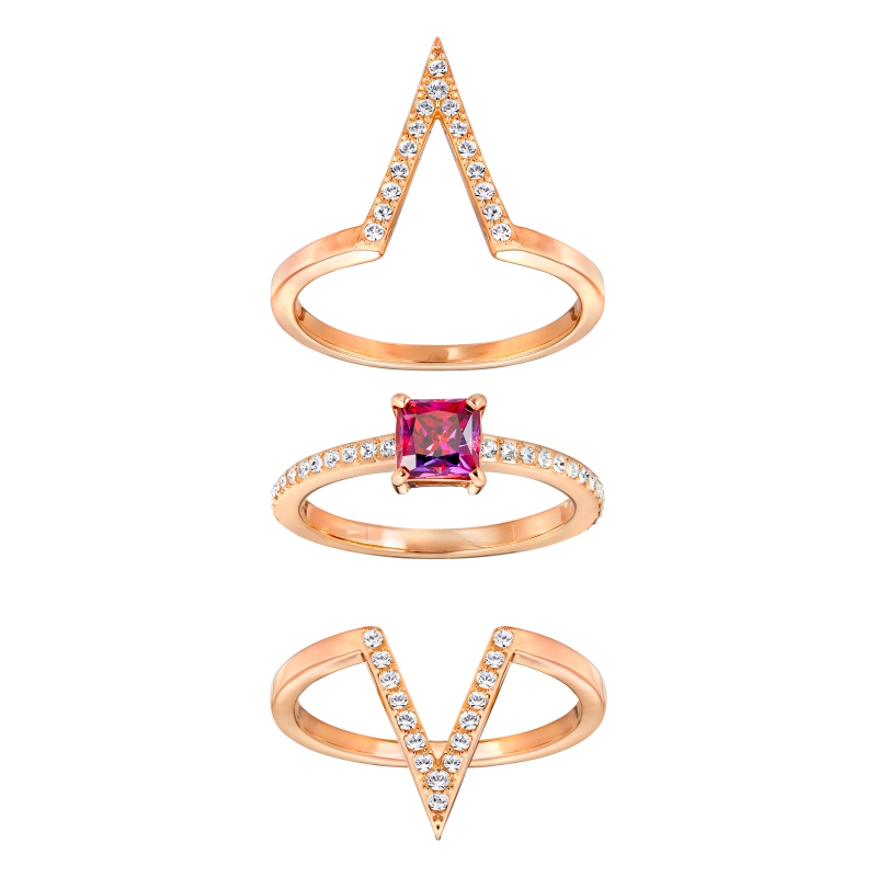 В этом роскошном кольце с покрытием из розового золота классический блеск изумительно сочетается с современным стилем. Это разноплановое изделие: три кольца можно носить вместе или по отдельности в сочетании с другими украшениями. Красный квадратный кристалл сверкает на фоне шевронов с прозрачным кристальным паве. Такой аксессуар мгновенно внесёт в ваш костюм ноту изысканности. Чтобы получился ещё более яркий образ, добавьте другие украшения из коллекции Funk.