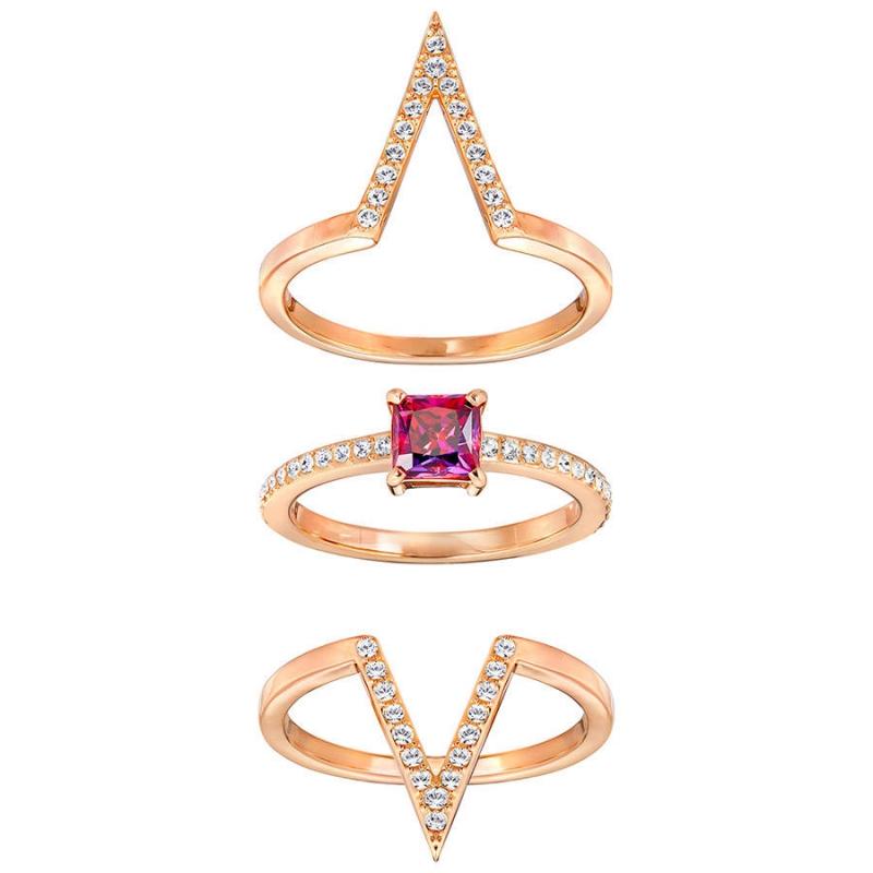 В этом роскошном кольце с покрытием из розового золота классический блеск изумительно сочетается с современным стилем. Это разноплановое изделие: три кольца можно носить вместе или по отдельности в сочетании с другими украшениями. Красный квадратный кристалл сверкает на фоне шевронов с прозрачным кристальным паве. Такой аксессуар мгновенно внесёт в ваш костюм ноту изысканности. Чтобы получился ещё более яркий образ, добавьте другие украшения из коллекции Funk.