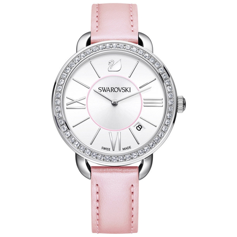 Эти элегантные сверкающие часы Swarovski оригинальной расцветки прекрасно подходят на каждый день. Характеристики: корпус из нержавеющей стали с 52 прозрачными кристаллами на безеле, 37 мм; серебристо-белый циферблат с рисунком в виде солнечных лучей с закреплёнными метками и римскими цифрами и логотипом в виде лебедя на уровне метки 12 часов; ремешок из розовой натуральной кожи, 20 см; кварцевый механизм сделан в Швейцарии. | |