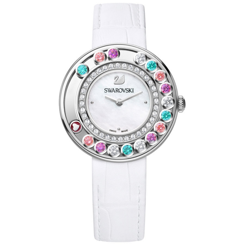 Эти кокетливые женственные часы украшены подвижными элементами, которые перемещаются по периметру круглого циферблата. Характеристики: корпус из нержавеющей стали с 16 подвижными фианитами SWAROVSKI оттенков Pink, Purple, White и Mint Green, 35 мм; перламутровый циферблат с логотипом в виде лебедя на уровне метки 12 часов; белый ремешок из телячьей кожи с тиснением «подкрокодиловую кожу», с пряжкой из нержавеющей стали, 18,5 см; кварцевый механизм сделан в Швейцарии. | |