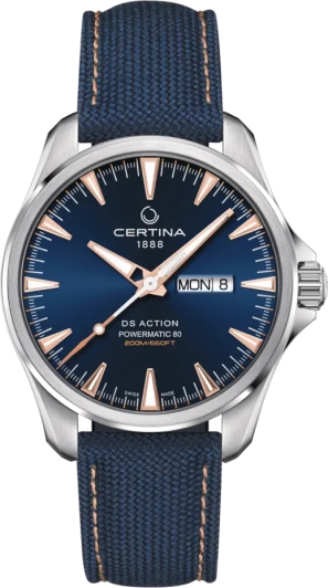 Брендовая модель имеет синий циферблат с контрастными стрелками и часовой разметкой, что обеспечивает хорошую читаемость показателей в любых условиях. Тканевый ремешок надёжно обхватывает запястье, а застёжка «бабочка» с кнопками предотвращает случайное расстёгивание. Часы работают за счёт швейцарского пружинного механизма ETA Powermatic 80, его запас хода увеличен до 80 часов. Соблюдение DS Concept. Корпус из нержавеющей стали 316L. Сапфировое стекло с покрытием «антиблик». Водозащита 200 метров. Люминисцентное покрытие SuperLumiNova. Завинчивающаяся задняя крышка. Защищённая заводная головка. Календарь с индикацией числа и дня недели. Диаметр корпуса: 41 мм.