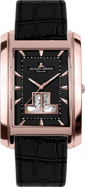 Для корпуса часов 1-1368, сделанного из нержавеющей стали с PVD-покрытием из розового золота, дизайнеры выбрали модную форму прямоугольника. Благодаря эргономичным ушкам корпус удобно ложится на запястье. На черном циферблате часов, центральную зону которого украшает традиционный рисунок гильоше, реализована оригинальная идея по оформлению открытого баланса: он сделан в виде двух латинских букв, J и L, логотипа бренда Jacques Lemans. Часовая и минутная стрелки покрыты люминесцентным составом, чтобы легко читаться даже в темноте. Задняя крышка прозрачная, закреплена на четырех винтах. Часы установлены на ремешок из натуральной кожи черного цвета. Автоматические часы 1-1368 – классика, модная вне зависимости от капризов моды, это статусный аксессуар, уместный как в ансамбле с деловым костюмом, так так и с более расслабленным образом в повседневном стиле