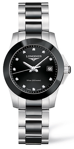 Женские кварцевые часы (ETA 956.112), корпус и браслет из нержавеющей стали (316L) с керамической вставкой, диаметр корпуса 29,5 мм, сапфировое стекло, функции: дата, часы, минуты, и секунды, водозащита до 30 атм.