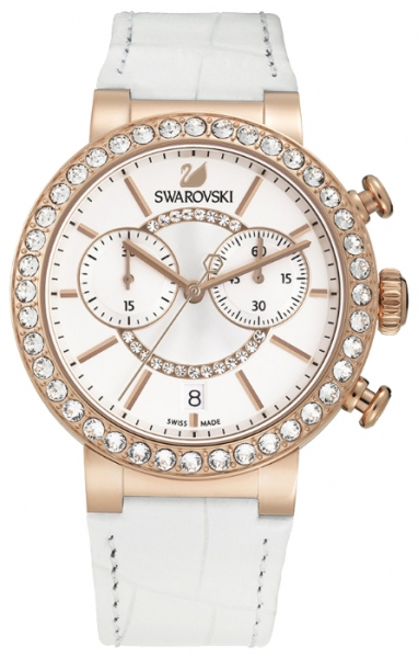 | Женские гламурные часы в спортивном стиле. Описание: корпус – PVD покрытие из розового золота, 40 прозрачных кристаллов, 38 мм; циферблат – серебристо-белый с рисунком в виде солнечных лучей, прозрачное кристальное паве в центре, 2 дополнительных циферблата; цифры – закреплённые метки с PVD покрытием из розового золота, логотип в виде лебедя на уровне метки 12 часов, индикатор даты на уровне метки 6 часов; ремешок – белая телячья кожа с тиснением под крокодила; механизм – кварцевый, сделан в Швейцарии; стекло - сапфировое; водонепроницаемость - 30 м. | |