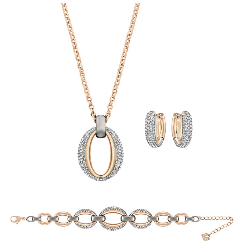 Этот комплект броских украшений органического дизайна состоит из подвески, браслета и пары серёжек. Все украшения сделаны из цепочек панцирного плетения с покрытием из разных металлов и сверкающими тёмными кристаллами в закрепке Pointiage®. Результат – изысканный и модный современный образ. | |
