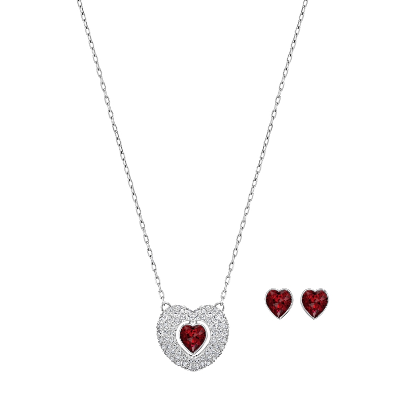 Этот классический комплект украшений – ожерелье и серьги с родиевым покрытием – придаст очарования и изысканности повседневному образу. Ожерелье декорировано красным кристальным сердцем в обрамлении прозрачного кристального паве. Блестящие серьги в форме сердца сделаны из красных кристаллов. Это прекрасный подарок и на День святого Валентина, и на любой другой праздник. Длина ожерелья – 38 см, серёгразмер серёг – 0,5 см. | |
