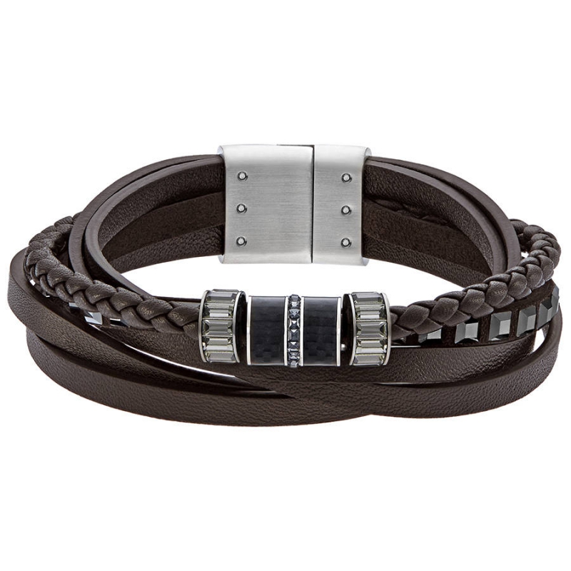 Браслет Swarovski Alto мужского дизайна сделан из таких материалов как коричневая кожа, углерод и сдержанно поблёскивающие чёрные кристаллы огранки «багет». Магнитная застёжка обеспечивает надёжную фиксацию. На выбор предлагается два размера (M и L). | |