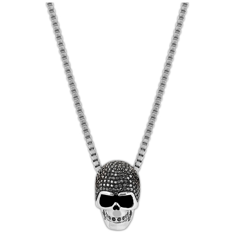 Эта уникальная подвеска внесёт в любой образ ноту дерзкого рока. Металлический череп с родиевым покрытием украшен кристаллами цвета Jet Hematite в закрепке Pointiage®. К подвеске прилагается цепочка из нержавеющей стали. | |