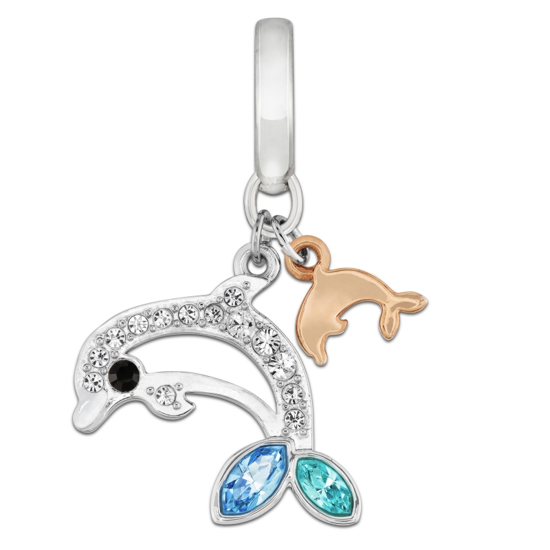 Эта очаровательная подвеска изображает двух дельфинов с покрытием из разных металлов. Они сверкают разноцветными кристаллами. Это украшение прекрасно дополнит браслет или ожерелье. Добавьте другие подвески в том же стиле, чтобы получился образ морской тематики. | |